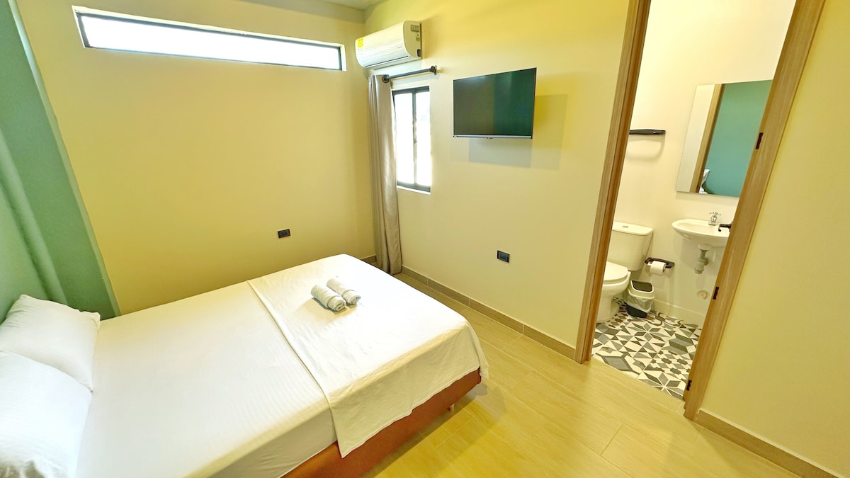 Habitación privadas con 1 cama doble (1.4m ancho), aire acondicionado y baño interno. Espacios sencillos y funcionales, sin ventanas, ideales para descansar cómodamente después de un día de actividades. Servicios incluidos ✔ Aire acondicionado ✔ Cama doble ✔ Televisión ✔ Wifi con buena señal ✔ Baño privado ✔ Espacio práctico para una estadía tranquila Ideal para: Viajeros que buscan un alojamiento básico, cómodo y bien ubicado, sin lujos.