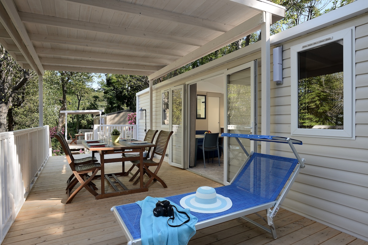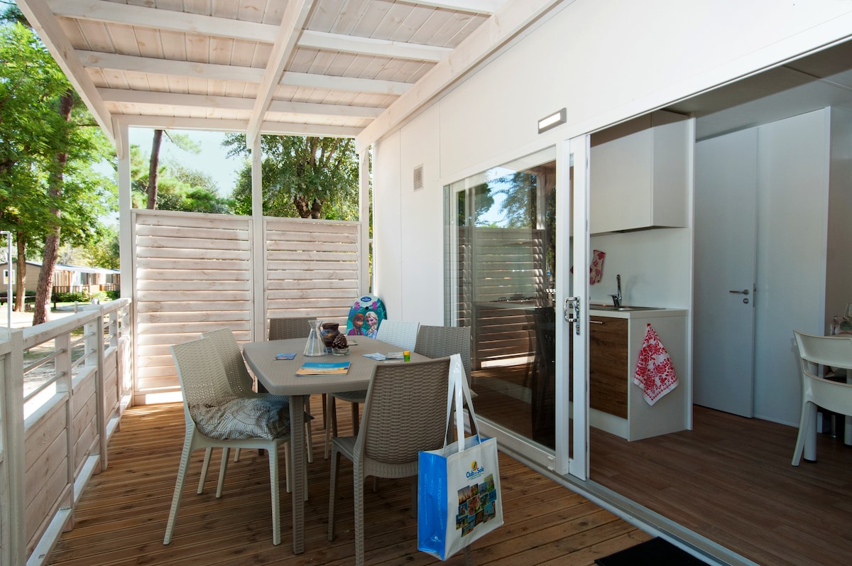 Dimensioni: 24mq + ampia veranda in legno, Animali ammessi su richiesta in alcune unità, 2 camere da letto: una matrimoniale e una camera con 2 letti singoli + 1 letto a soppalco, Soggiorno con divano, angolo cottura attrezzato con microonde, frigorifero e freezer, 2 bagni con doccia, lavandino e wc (no asciugacapelli), Aria Condizionata / Riscaldamento, TV, Veranda con tavolo e sedie da giardino