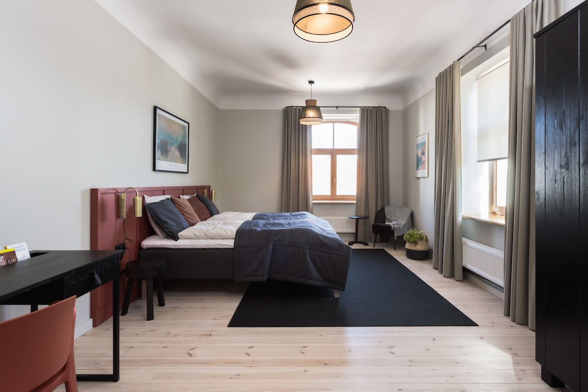 The charming Old Town Apartment sits on the ground floor of a historic building in the vibrant heart of Cēsis. Step outside to lively bars, cozy cafés, and outdoor dining, while inside remains peaceful thanks to a quiet inner courtyard. Guests can use two bicycles to explore the city, its medieval sights, and the scenic paths of Gauja National Park.