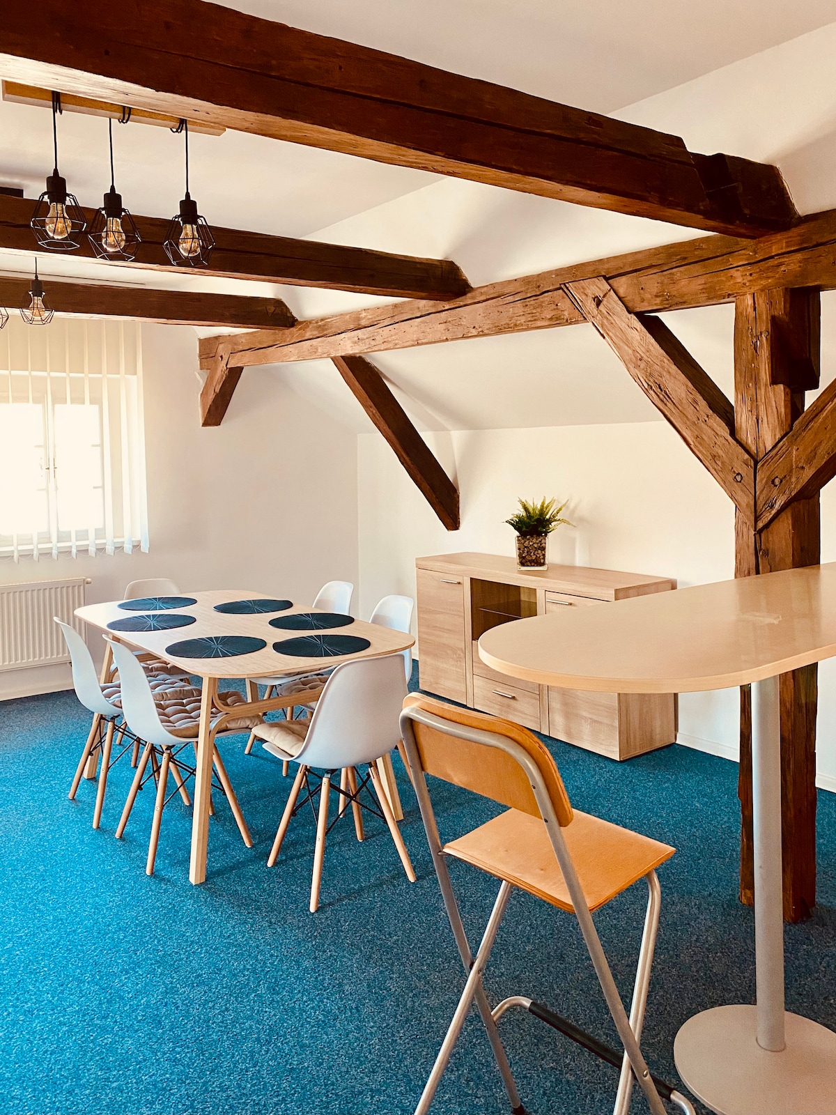 The apartment on the top floor is truly unique. It is located on the second floor and and the entire place has been restored to original building. The original roof wooden frame, exposed brickwork, original flooring, fully functional wooden stove helps you to imagine what people lived like at the beginning of last century. The main living area is facing the front of the house and therefor you will find a view on the town square, town house and the famous basalt rock “Jehla”.
