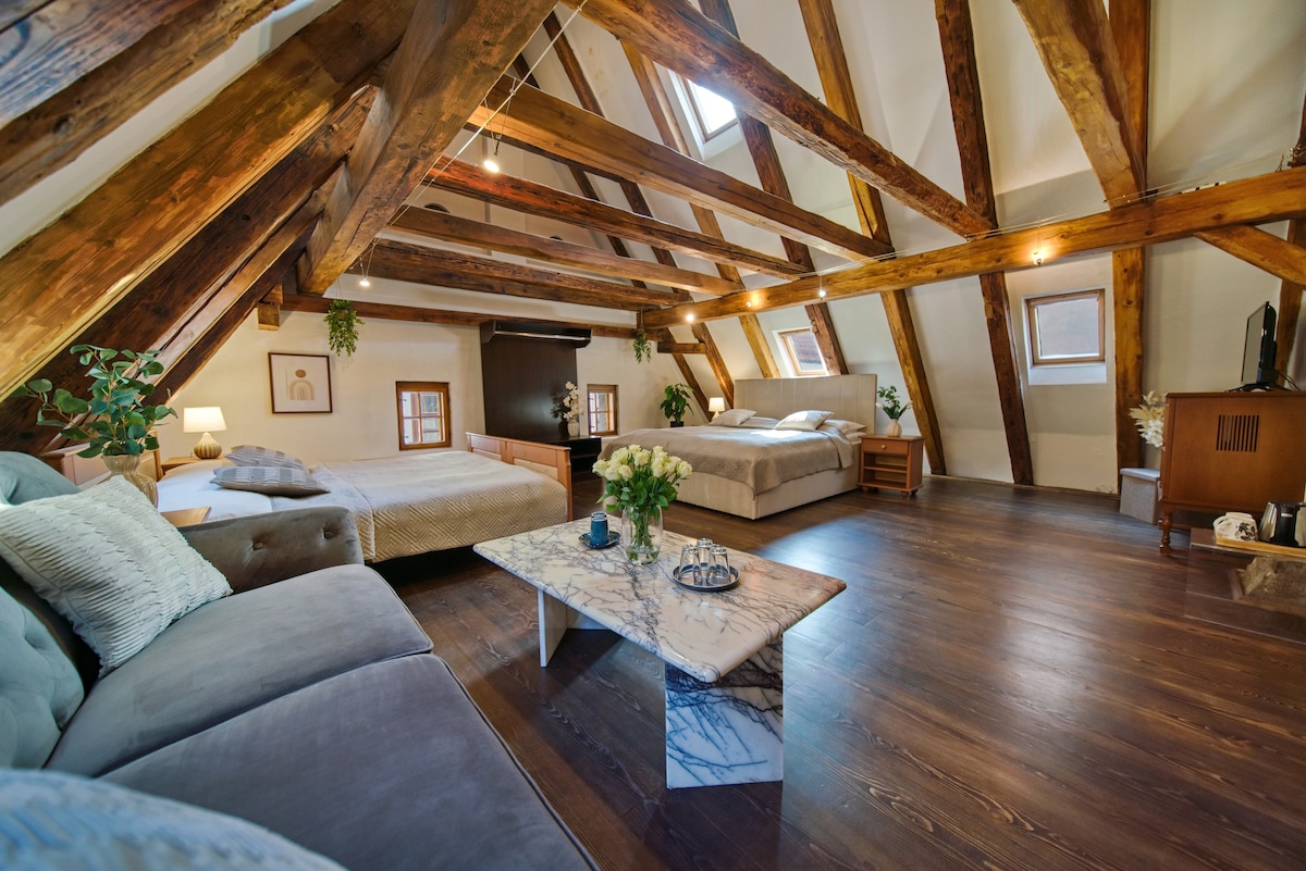 The pride of our hotel Švamberský dům is the attic apartment with a bathtub located right in the middle of the room. In the generously designed spaces, you will be impressed by the original preserved medieval exposed and restored roof trusses. The suite has a spacious relaxation area with a television. The bathroom is equipped with a shower, a bathtub in the middle of the living room, a hair dryer and a separate toilet.