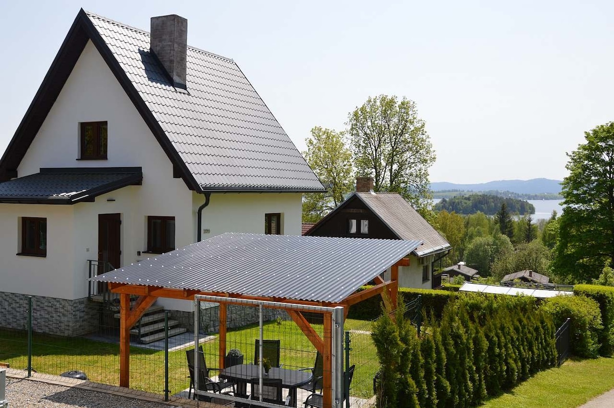 Nově postavený prázdninový přízemní dům s výhledem na Lipno nabízí ubytování až pro 8 osob. Ložnice s manželskou postelí, pokoj s palandou 2+1 lůžko a jednolůžková postel, kuchyň spojená s obývacím pokojem s rozkládací sedačkou, koupelna. Venkovní vyvýšená terasa, gril, pohodlná zahradní sedačka. Možnost rezervace privátní venkovní sauny a bazénu s výhledem na hladinu Lipna (35 m daleko na sousedním pozemku). Vše pro krásnou rodinnou dovolenou či chvíle strávené s přáteli.