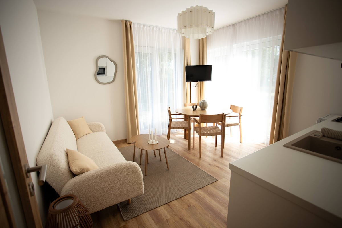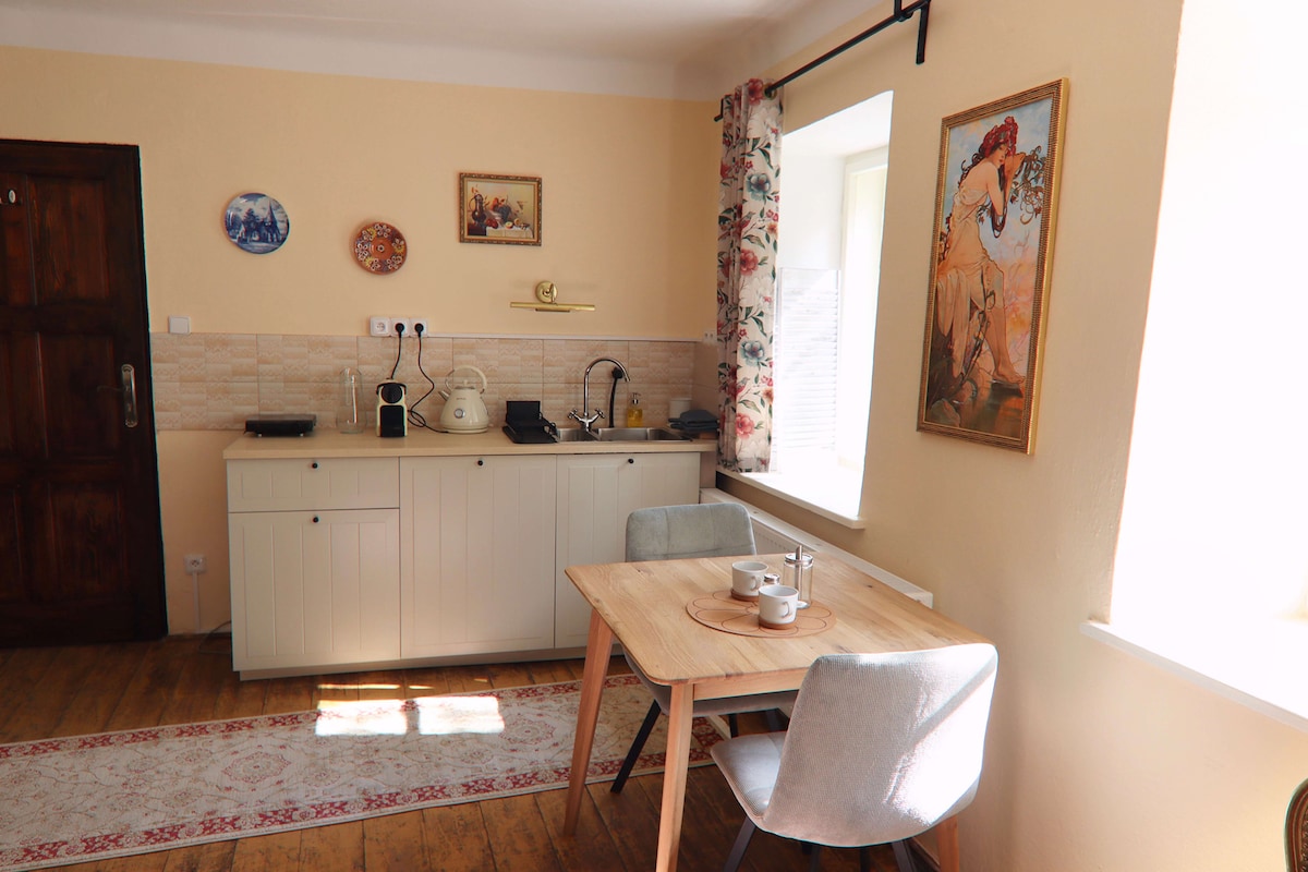 Suite for four, ground floor, 3 guests + extra bed This lovely suite for four situated on the ground floor has a separate entrance hall with the door leading to a generously proportioned kitchen which is equipped with a microwave oven, electric hob, electric kettle, fridge, basic cooking utensils, dining table, sofa bed for 2 guests. The entry to the bedroom with twin beds leads through the hallway. The spacious bathroom provides to our guests a comfortable bathtub with a shower.