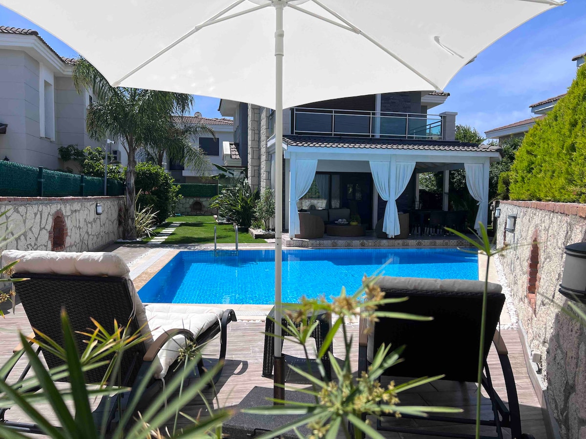 Evimizin etrafı izole havuz etrafında çocuklar için korumalıklar var bahçe duşu mevcut. evin bahçesinde kendine ait çocuk parkı var. bahçe mutfağı ve barbeküsü mevcut market ve plajlara çok yakın. 4 odalı 3 katlı ve 2. ve 3. katta banyo tuvalet 1. katta sadece tuvalet bulunmaktadır.Yatak odaları ile teras ve balkondan deniz manzarası vardır.