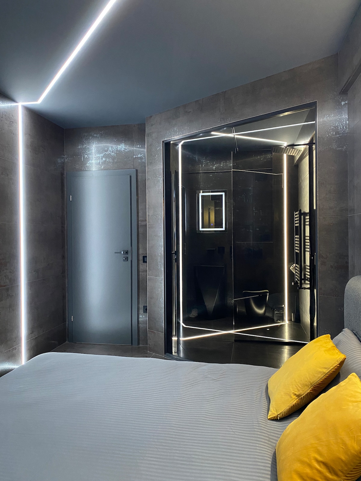 A futuristic design experience with ambient LED lighting and premium finishes. Perfect for couples or modern travelers seeking comfort, style, and elegance. Features include a smart TV, floating bed, luxurious bathroom, sleek furniture, and an immersive mood. Located in a vibrant area, Luna Apartments offers the perfect blend of technology and relaxation for an unforgettable city escape.