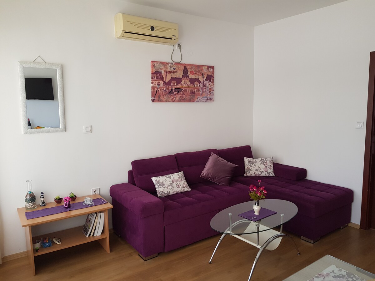 Our one-bedroom apartment is located only 2 minutes(150m) away from the sea, Slovenska beach and main promenade in Budva and it has a beautiful sea view from terrace. Apartment is on the first floor. It can comfortably accommodate 4 persons. Our apartment has fully equipped kitchen, wi-fi, cable TV, air conditioner... Although we have been renting for years this is our first time on Airbnb and we are looking forward to meet you!