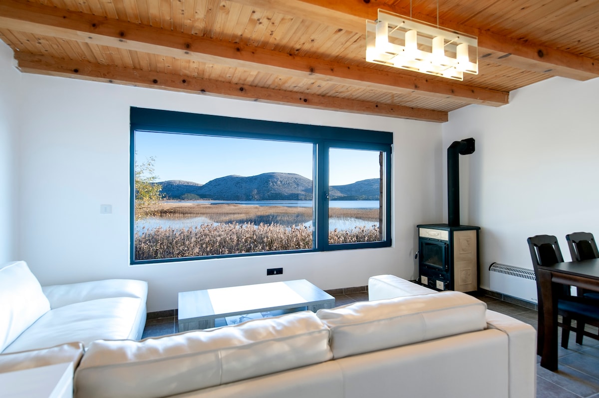 In the heart of the national park "Skadarsko Jezero" lies a secluded, incredibly quiet waterfront house. The area has one of the richest birdlife in Europe. The house was built in 2012, renovated in 2019. You'll find a cozy living room with a kitchen, dining table and a comfortable sofa with spectacular views of the lake and mountains. The 40m2 terrace invites you to rest and watch the wildlife and listen to the sound of nature. If weather is stable, a wooden boat is available to visit the lake