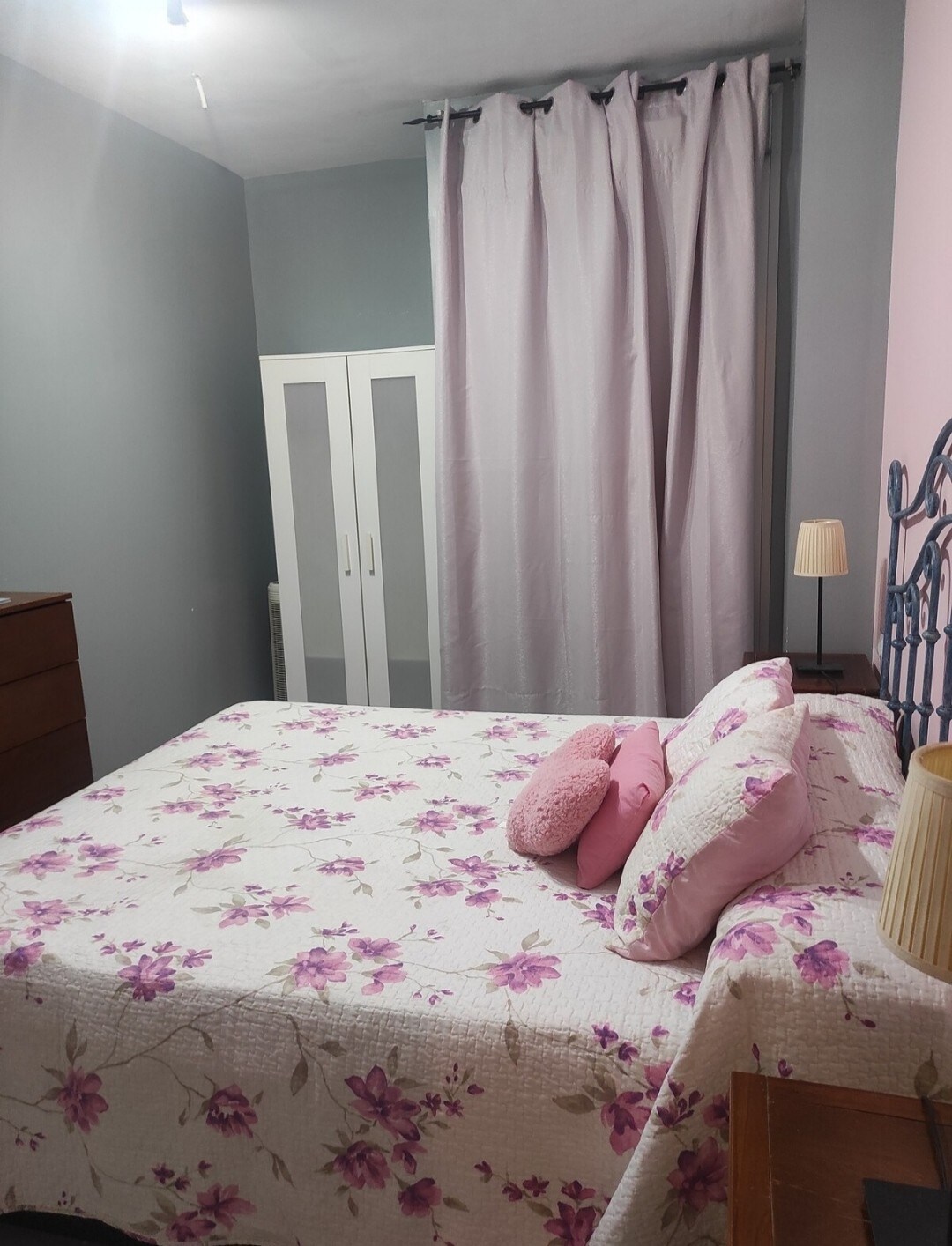 Cómoda habitación para hasta dos personas. muy luminosa con un gran ventanal, cuenta con zona de almacenaje como armarios y cajones. tiene baño privado amplio, con una gran bañera ideal para un momento de relax y desconexión. cuenta con zonas comunes como sala de estar, cocina totalmente equipada y comedor, además de un acceso a una terracita ideal para sentarse al fresco en la mañana con un café. tiene wifi, televisión, termo eléctrico y acceso en ascensor.