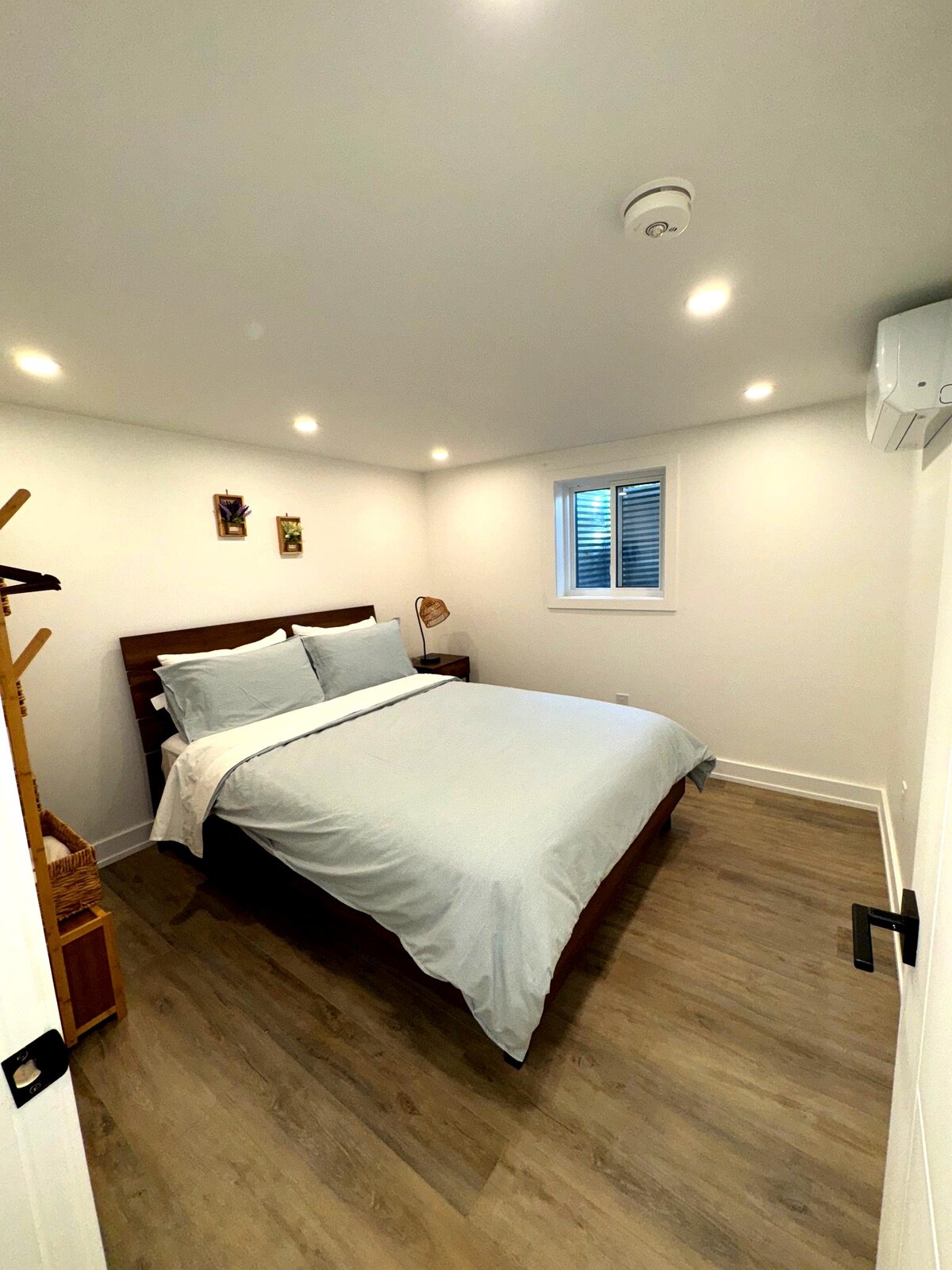 · Snowless Parking, 1 bed 1 bath, 1 living room, with full laundry and kitchen, refrigerator of course! and they are exclusively for your use! · Comfy environment with queen-size bed, cozy vibe, as well as keypad entrance to secure your safety. · Located in a quiet neighborhood. 1 minute to forest park and run field. · Provide 1 parking. 3 mins walk to bus stops. 10 mins drive to Highway 401. · Escape the busy and relax in this your premium highly privacy little basement apartment.