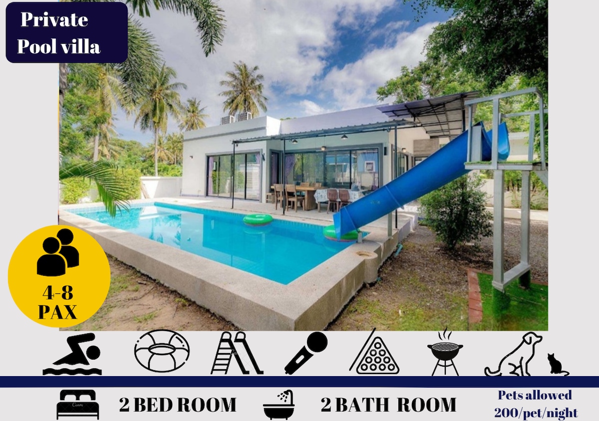🏡 Luxury Private Pool Villa in Hua Hin | 3BR, 3BA | Sleeps 10 Escape to Lazy & Relax @ Hua Hin, a modern and spacious 3-bedroom private pool villa, perfect for families, friends, and group getaways. With a private pool featuring a slide, a pool table, and elegant interiors, this villa offers the ultimate blend of relaxation and entertainment in a peaceful location near Hua Hin’s best attractions.