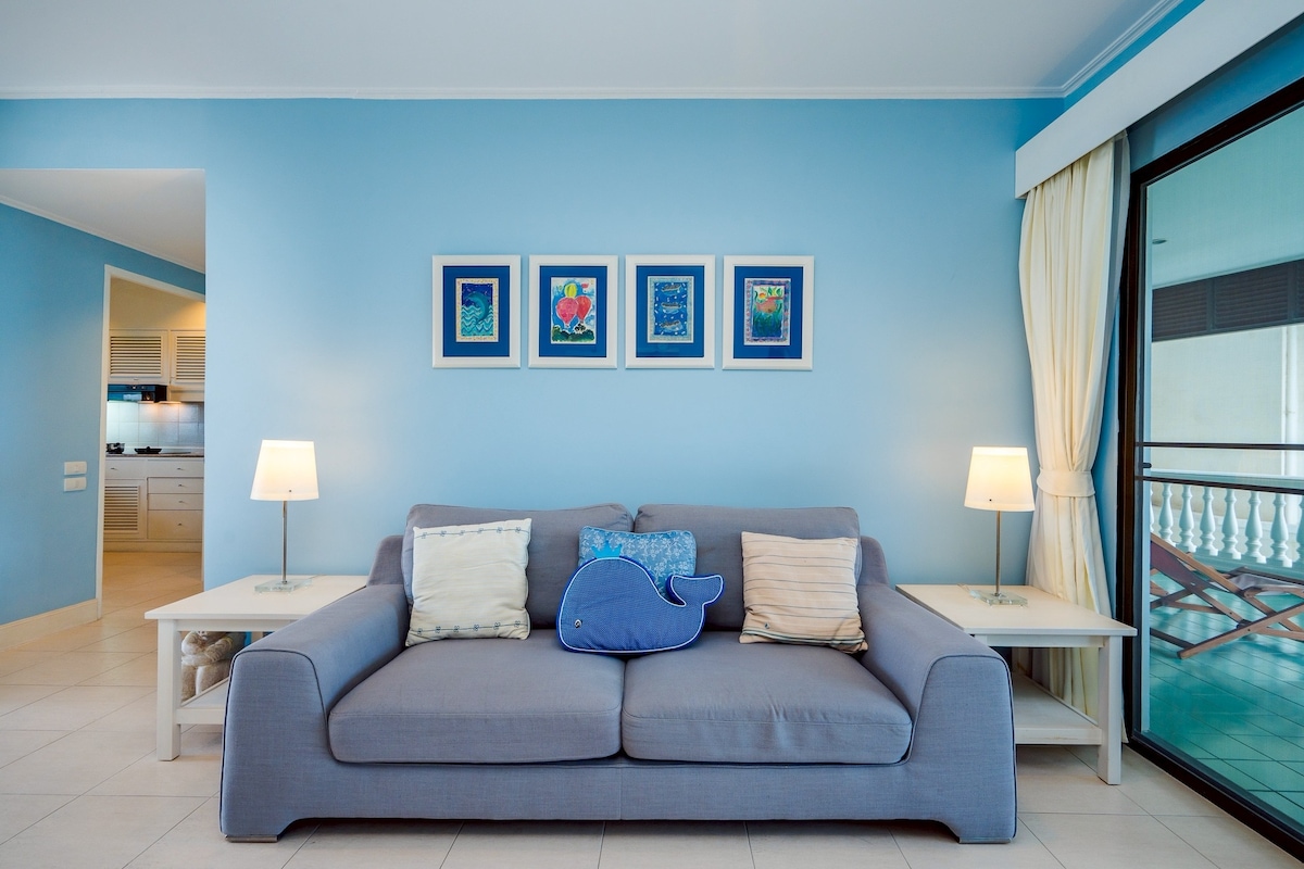Enjoy a calm, private beachfront vacation with a 105 sq.m. top floor spaces. - Relax with spectacular sea views located at Cha am, Thailand. Amenities include a private beach, 2 public pools, sauna, front office, laundry, maid services, THAI massage, Wi-Fi, 24-hr security, fitness, and a beautiful garden. Just 20 km from Hua Hin and a 2.5-hour drive from Bangkok. Perfect choices for couples, families, or groups of friends seeking a relaxing getaway.👍🏻