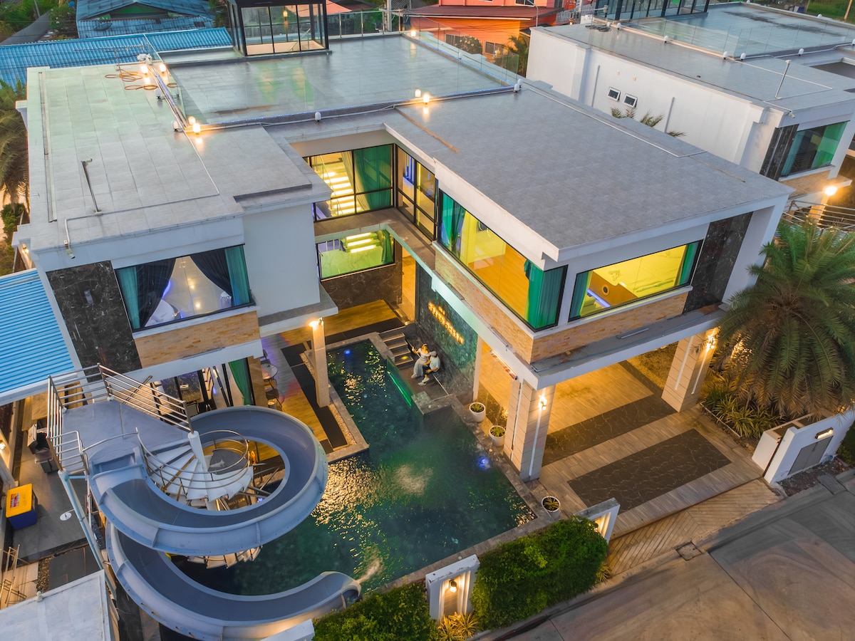 Baan Arthur, quiet & peaceful pool villa that would make you feel like staying at your own home. > Private villa for family and friends who really need a quiet place to stay. (up to 10 guests) > Private Pool with Slide and Safety equipment for kids. > 55” Smart TV and karaoke. > 2in1 Pool table and Air Hockey. > Seafood delivery (both fresh and cooked) + Food delivery + 7-11 Delivery. > 5 mins drive to 7-11, 20-25 mins drive to ChaAm beach. > 24hr support by the host team.
