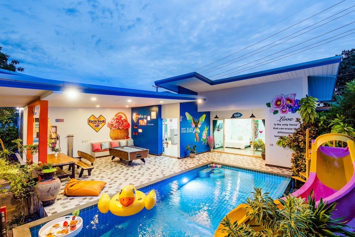 บ้านพักพร้อมสระว่ายน้ำส่วนตัว เหมาะสำหรับการมาพักผ่อนเป็นหมู่คณะ ไม่ว่าจะเป็นกลุ่มเพื่อนๆ หรือครอบครัวที่คุณรักสามารถรองรับลูกค้าได้ 12-15 คน มีเครื่องใช้ไฟฟ้าครบครัน พร้อมทั้งห้องครัวและเครื่องครัวต่างๆ รวมถึงเตาปิ้งย่าง และยังมีเครื่องเสียง คาราโอเกะ พร้อมไฟเทค ไว้สำหรับจัดปาร์ตี้ส่วนตัว อีกทั้งยังมีบริการฟรี Wi-fi และที่สำคัญอยู่ไม่ไกลจากร้านสะดวกซื้อใช้เวลาเพียง 5 นาที และใกล้กับเพลินวานใช้เวลาเพียง 15 นาที นอกจากนั้นยังสามารถไปตลาดโต้รุ่งใช้เวลาเพียง 20 นาที