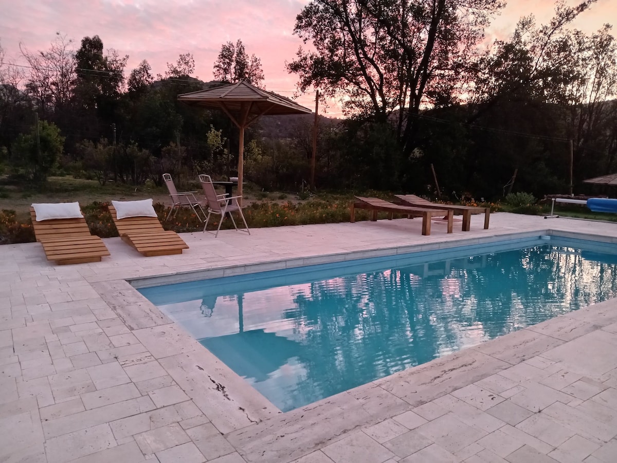 Nuestras cabañas ofrecen vistas impresionantes, despierta con el canto de los pájaros y disfruta del desayuno en tu terraza privada o en nuestro quincho, durante el dia refréscate en la piscina de diciembre a abril) y en la noche la tinaja se ilumina con un brillo especial, donde podrás relajarte bajo la luz de las estrellas. No contamos con cocina, pero tenemos una parrilla para que disfrutes tus preparaciones en familia o en pareja. ¡Vive la experiencia completa de Rocío de Caleu!