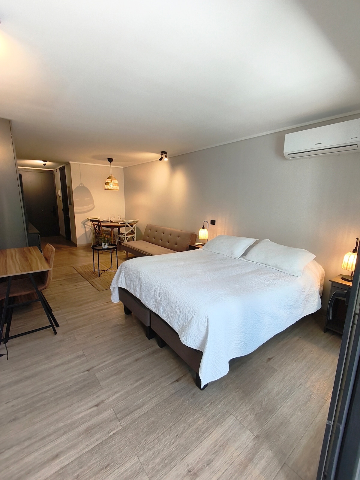 Estudio moderno nuevo y full equipado, único, con estilo propio, acogedor, con terraza, piscina infinita, gimnasio y parking privado, dentro de la zona más segura y exclusiva de Santiago: Las Condes. -Cama KING con ropa de cama -Parking incluido -Baño con amenities de cortesía (jabón, shampoo, papel higiénico) -Comedor con cocina, refrigerador, microondas y amenities (café, te, sal, azúcar, aceite). -2 Cafeteras (NESPRESSO-filtro) -Aire Acondicionado -WiFi -Smart TV -Lavandería.