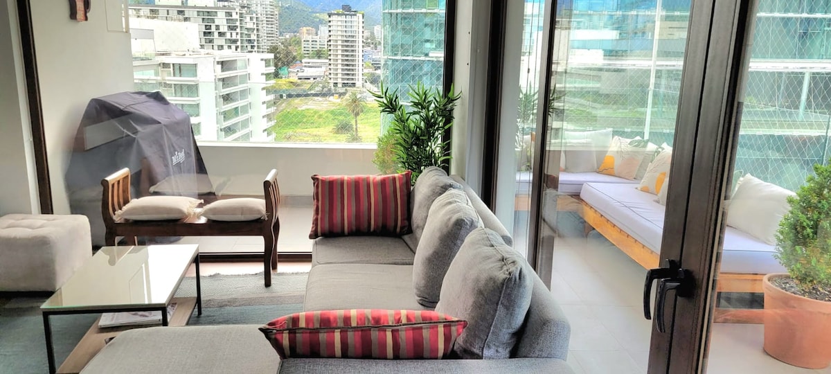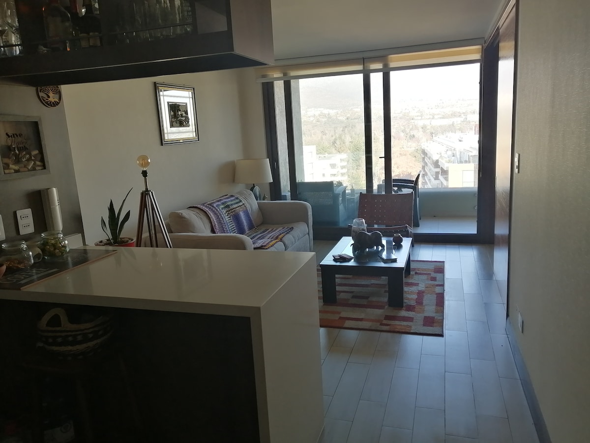 Enjoy this accommodation just steps from Clínica Las Condes, Líder supermarket, Alto Las Condes Mall, pubs, and restaurants. It has easy access to highways and public transportation. The apartment is equipped with all the comforts for 4 people, a Queen bed and a pull-out bed for 2. Have your privacy with us, we are one of the few that have a room with a sliding door. Fully equipped kitchen, bathroom with bathtub, and spacious terrace. PET-FRIENDLY AND WITH GREEN AREA VIEWS
