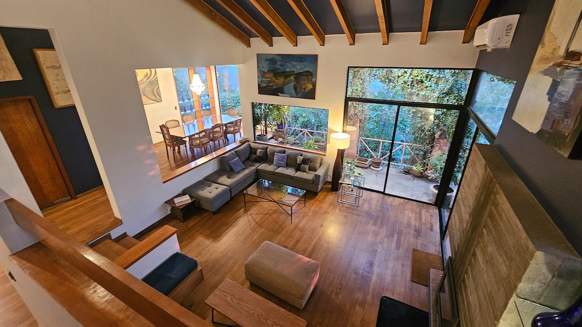 Premiado en arquitectura y recién renovado, un lugar único y acogedor con vistas panorámicas de Los Andes para disfrutar con familia y amigos o para solo desconectarse. Ubicada en un barrio tranquilo y exclusivo de Santiago, al final de una calle cerrada con total privacidad, cerca de restaurantes y parques. Cuentas con múltiples terrazas, jardines, gimnasio, quincho y piscina y a 5 minutos de Costanera Norte para llegar a todos los sitios destacados de Santiago para una estancia inolvidable.