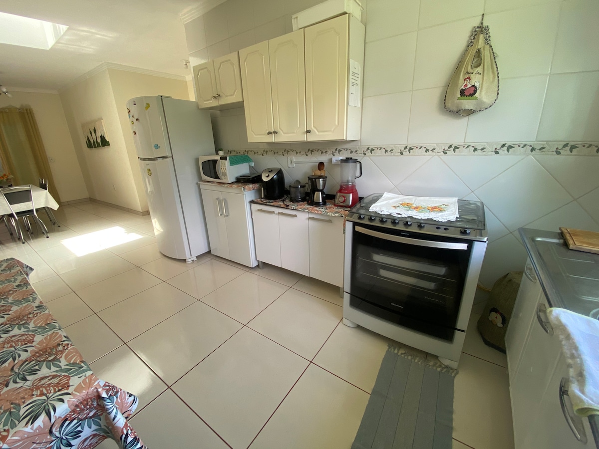 Casa de campo com lareira e jardim privativo; Lugar plano com muita natureza ao redor; Desfrute de manhãs tranquilas em nossa varanda ensolarada, e a alegria dos momentos em família, perfeita para um café da manhã relaxante com vista para o jardim e piscina, e apreciando o cantar dos pássaros; Muro alto, segurança para seu pet; Wi-Fi internet 480 mega fibra óptica; Churrasqueira; Piscina com hidro, luzes; Ambiente familiar para toda família ; Ofereço roupas de cama, exceto de banho.