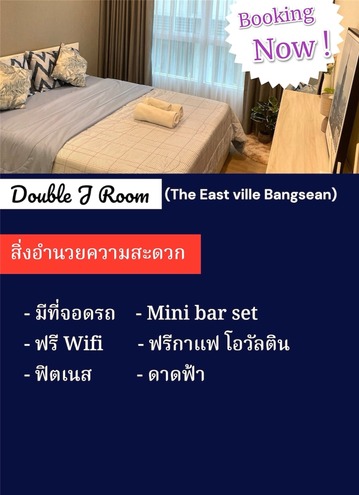 Our place is close to a department store, Park-in Night Market, and Toshin Japanese Market — two of the most popular markets right now. There are also many trendy bars and restaurants nearby. 7-11 just around the corner, and there’s also a 7-Eleven vending machine on the first floor. Bang Saen Beach is not far, perfect for a quick seaside escape. We use premium pillows and bedding to make sure your stay is as comfortable as possible. We hope you’ll find it even cozier than other places.