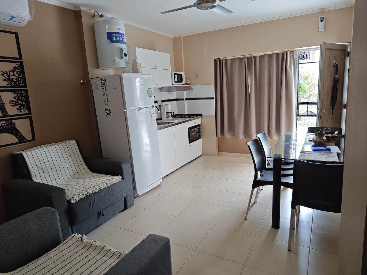 Monoambiente en pleno centro de Corrientes Capital, a 30 mts de la peatonal, consta de una divisoria para la habitación. 1 cama king size, amplio guardarropa espejado, aire acondicionado, TV 43 full HD, cable, barra de ducha con hidromasaje, termo-tanque, baño privado. En el living sofá, mesa ratona, En equipamiento, microondas, horno eléctrico con anafe eléctrico, heladera, desayunador completo y equipamiento para cocinar y comer alli con accesorios.