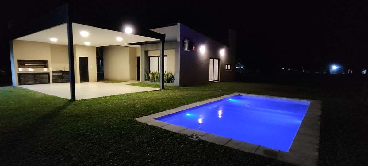 Relájate y desconecta en este alojamiento elegante y acogedor. Hermosa casa, muy cerca de la ciudad pero con la tranquilidad de la zona rural, con todas las comodidades necesarias para tener una estancia fabulosa. Aire acondicionado en todos los ambientes. Amplio quincho con parrilla y piscina. Se encuentra ubicado en el barrio "San Andrés", con acceso sobre la ruta 11 km 1016,5; con personal de seguridad las 24 hs.