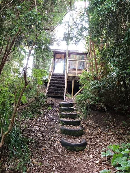 Cabaña recién construida sobre una loma pequeña, en plena selva patagónica, tipo bosque templado Valdiviano. Está ubicada a 100 metros de senda caminable a pie de última calle del pueblo. Permite una conexión profunda con la flora y fauna del lugar. Sitio preferente para la contemplación de aves de la zona y la ornitología especializada. Terreno sin vecinos inmediatos, colinda solo con selva tupida. A 15 minutos caminando de la playa central. La terraza mira al oeste con luz solar privilegiada.