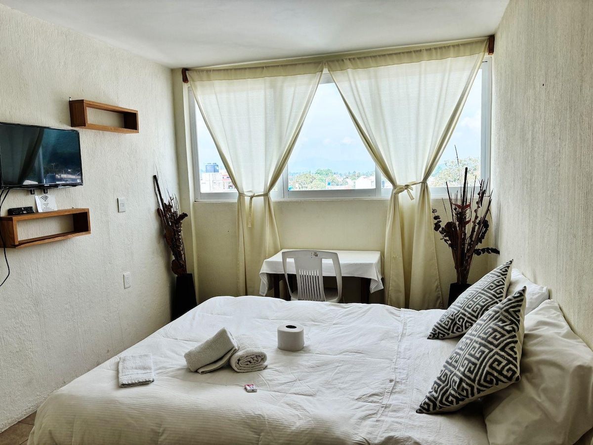 Estudio exclusivo en el centro de Amecameca de Juaréz, justo a 15 metros de la terminal de autobuses (Volcanes). Cuenta con baño equipado, habitación amplia, zona de TV y trabajo, entrada independiente, self check-in y luz automatizada. Disfruta de su fachada colonial única y un delicioso desayuno incluido. Ideal para descansar o trabajar con comodidad. ¡El único estudio con estas características en la ciudad!