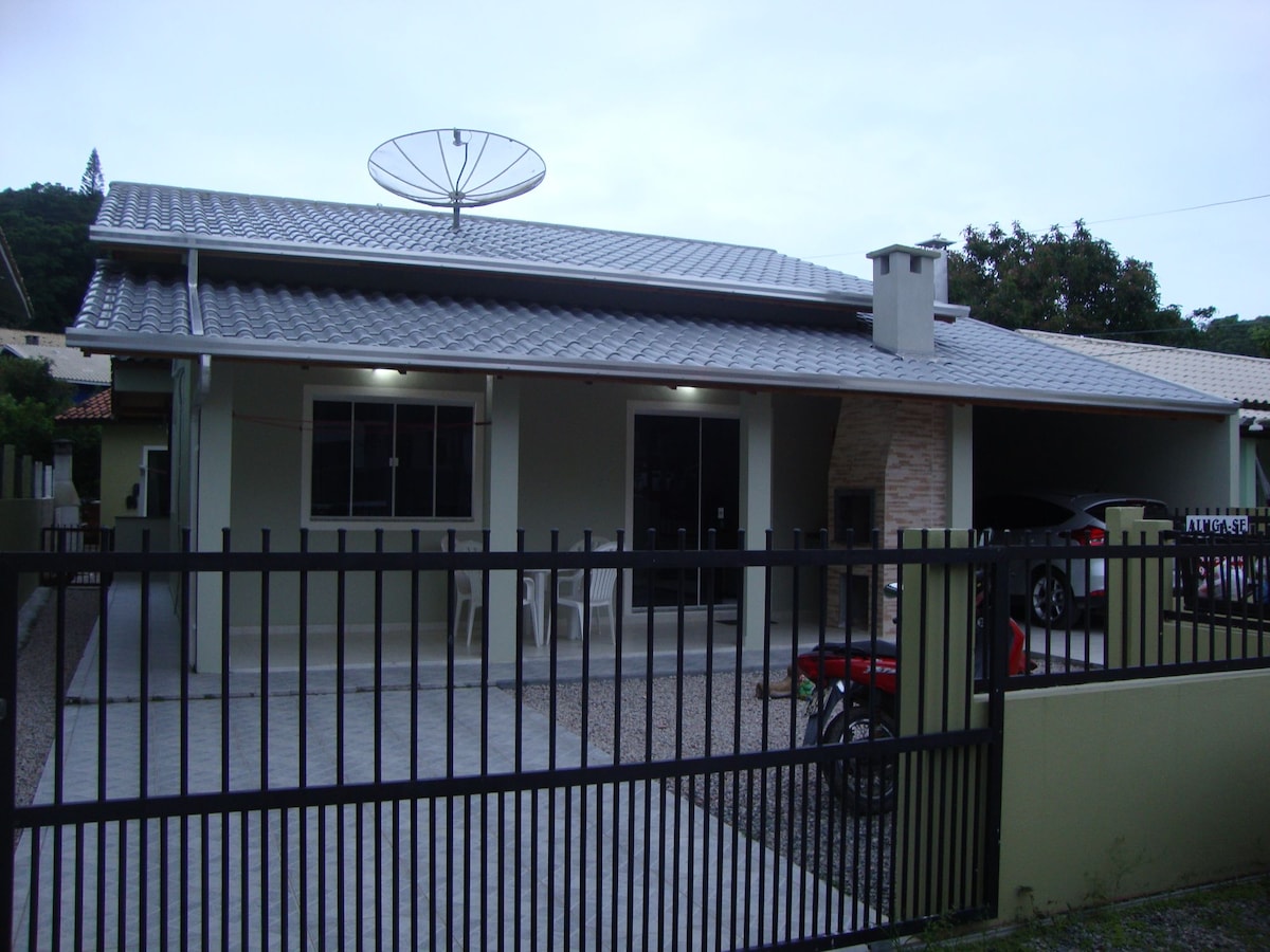 Relaxe com toda a família nesta acomodação tranquila. Casa confortável com dois quartos com camas de casal, banheiro, sala e cozinha nesta um sofa cama, churrasqueira e garagem, portão eletrônico, internet e ar condicionado nos quartos. Super segura pois o PROPRIETÁRIO MORA NA CASA DA FRENTE, alugamos casa de trás. A 400 metros da praia de Bombas e a Passarela do Ribeiro, restaurantes e mercado