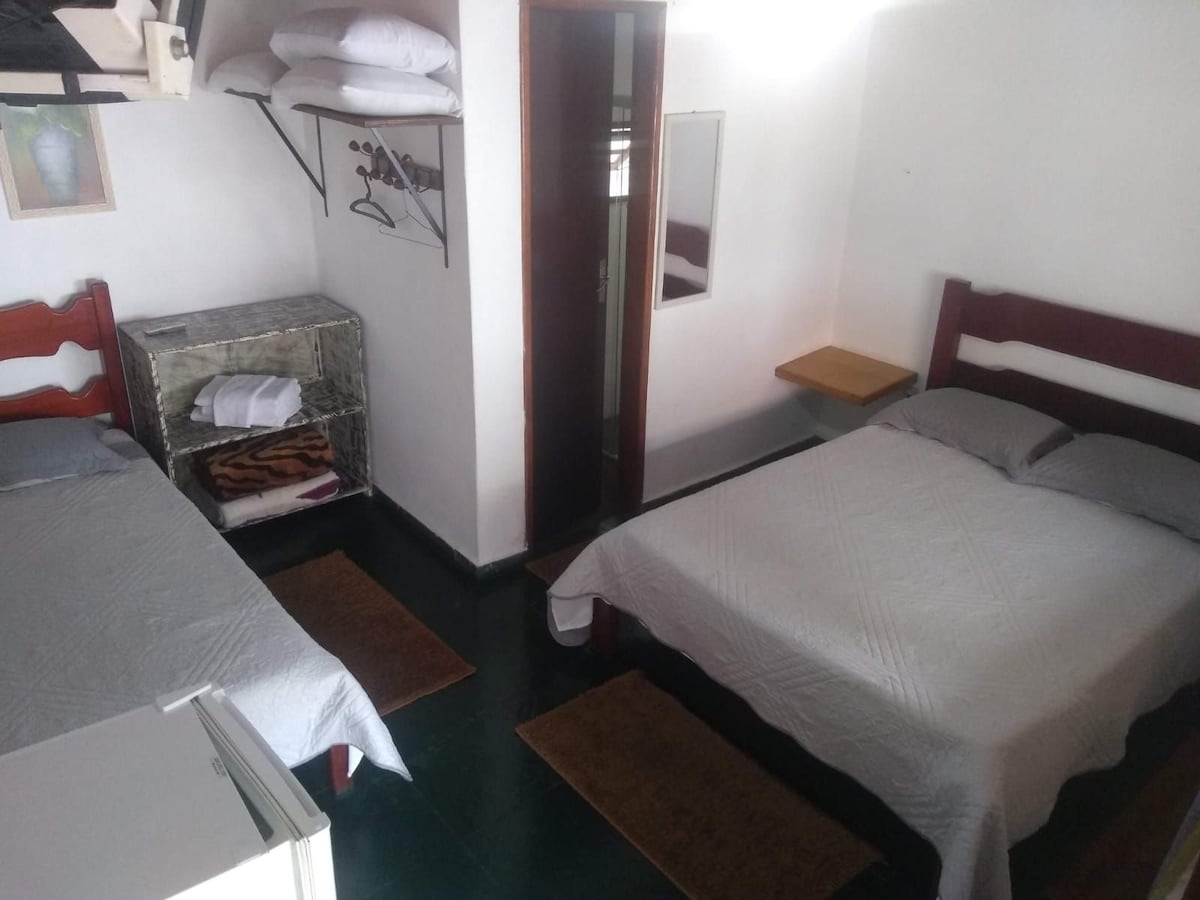 Suíte Gratidão: Para casal ou para até 5 pessoas. 1 cama de casal; 1 treliche; café da manhã; televisão 32 polegadas; frigobar; ar condicionado; roupas de cama e toalhas; banheiro privativo; água.
