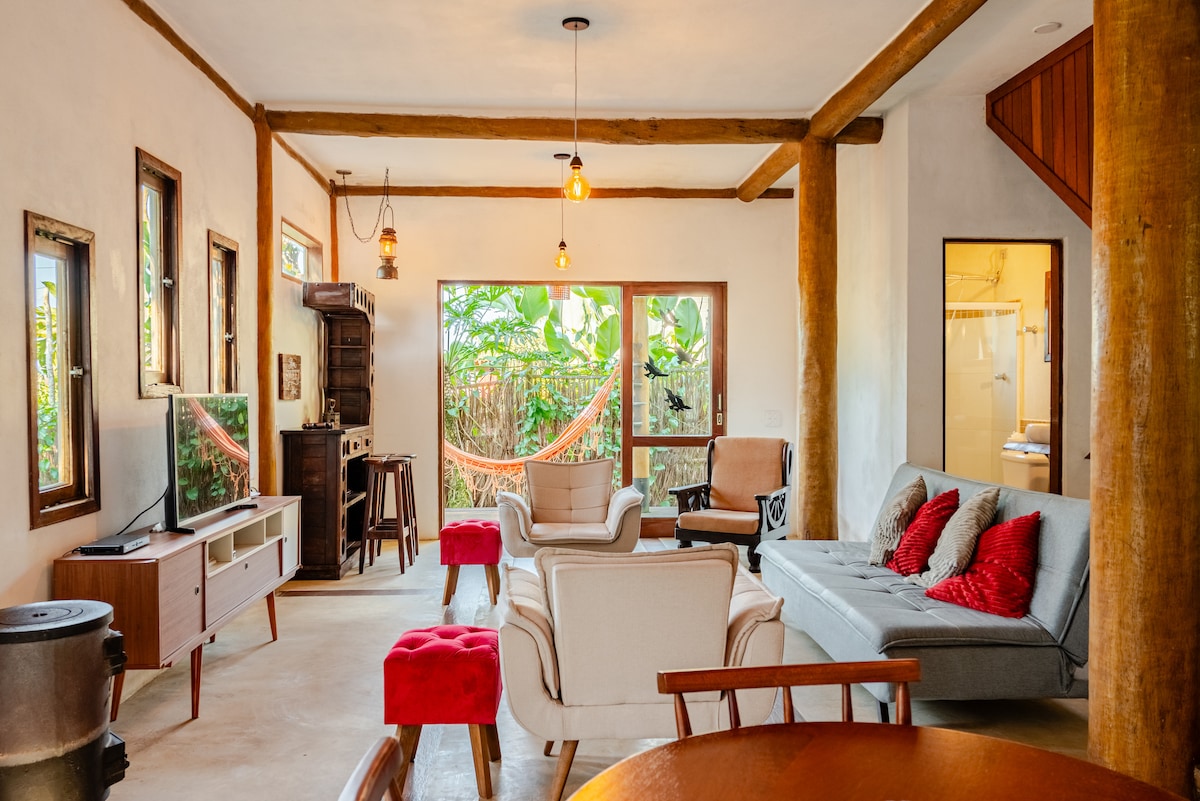 Charmosos estúdios self catering na linda praia do Prumirim. Entrada independente, pátio privado, cozinha totalmente equipada, cama queen size de alta qualidade, sala de estar confortável. Tudo projetado com qualidade, conforto e estilo. Grandes janelas panorâmicas que vão fazer você se sentir entre as copas das árvores! Este é um lugar mágico para quem procura uma fuga romântica à beira-mar conectando-se à natureza sem comprometer seu conforto. Tudo meticulosamente limpo, sanitizado e seguro!