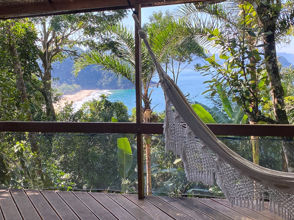 A casa fica integrada na mata, na copa das árvores, com vista para o mar, dentro do condomínio, no morro do canto direito da Praia do Félix, na parte mais bonita e preservada do Município de Ubatuba. Aqui você acorda com os sons da mata Atlântica e das ondas. São 3 suítes, redes, sofás, TV com DVD, internet rápida e churrasqueira. Essa é a casa perfeita para quem quer curtir sossego e natureza, com toda tranquilidade do mundo.