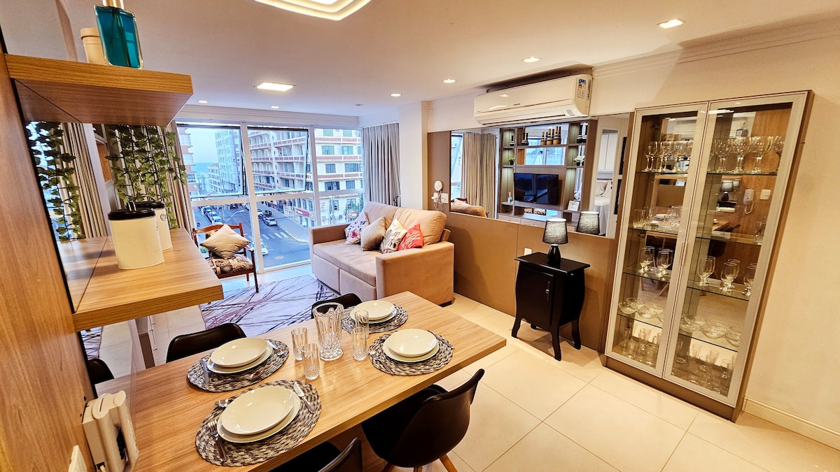 Complete apartment in the city center, close to markets, cinema, restaurants and shops. Less than 5 minutes from the sea! 😃 The apartment has a bedroom, living room, bathroom and kitchen/utility area, fully furnished and ready for use. In the living room, the apartment has a double-size sofa bed. Sea views from both the apartment and the terrace, which has a swimming pool, gym and leisure area. Also includes TV with Netflix and other streaming services (not included), barbecue and garage