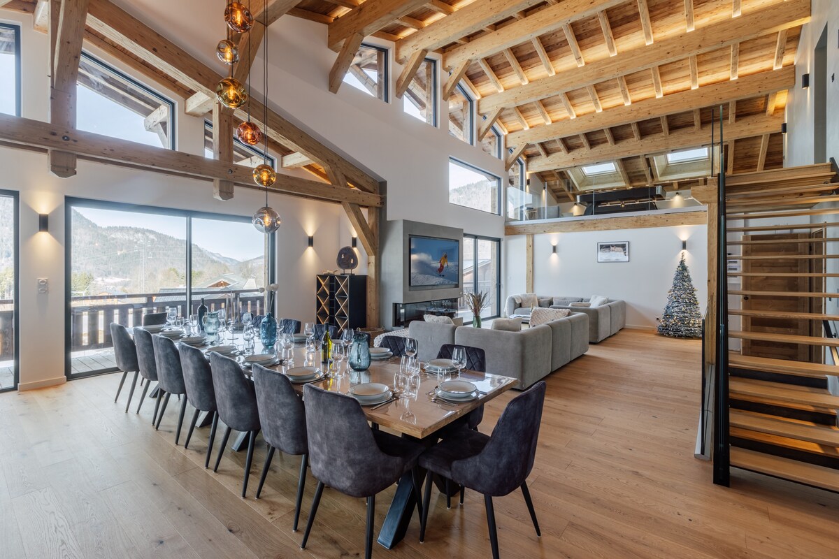 Grand chalet panoramique (190m2) face au Mont Blanc et proche d'un lac de baignade. Classé 4 épis. 4 chambres spacieuses (literie en 3*160cms et 2*90cms). 3 salles de bain dont 2 avec grande douche italienne et 1 avec baignoire. Sauna traditionnel avec vue panoramique par son hublot géant, vrai moment de détente et de récupération après l'effort ! Home Cinema - Babyfoot BONZINI - Enceinte CABASSE- Plancha Gaz etc...