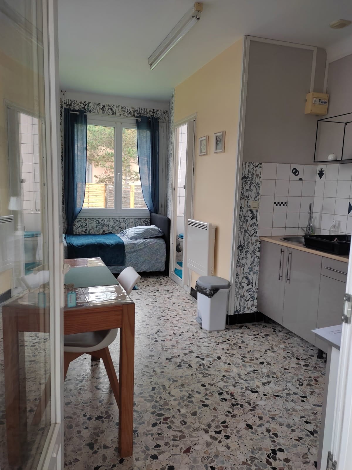 Studio de 15 m² composé de : - une salle de bain avec douche + lavabo + WC - une pièce de vie avec : * un lit d'une personne + table de chevet + commode * une cuisine toute équipée (vaisselle, micro-ondes, cafetière, bouilloire, grille-pain, frigo, meuble de rangement, plaque de cuisson, hotte) - chauffage électrique - télévision - WIFI possible - terrasse bien exposée avec table et chaises donnant sur le jardin Logement en rez de jardin, indépendant avec accès privatif