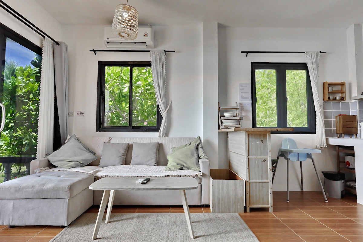 Stylish tropical cottage in the heart of Chaloklum, just a short walk to the beach, cafés, restaurants, and shops. Bright, fun, and thoughtfully designed space with a terrace and open green views. Perfect place to enjoy island life, work remotely, explore the island, and come back to a comfortable and inspiring space. PERFECT FOR ✔ Solo travelers ✔ Digital nomads ✔ Couples ✔ Active island life ✔ People who want good vibes & stylish spaces