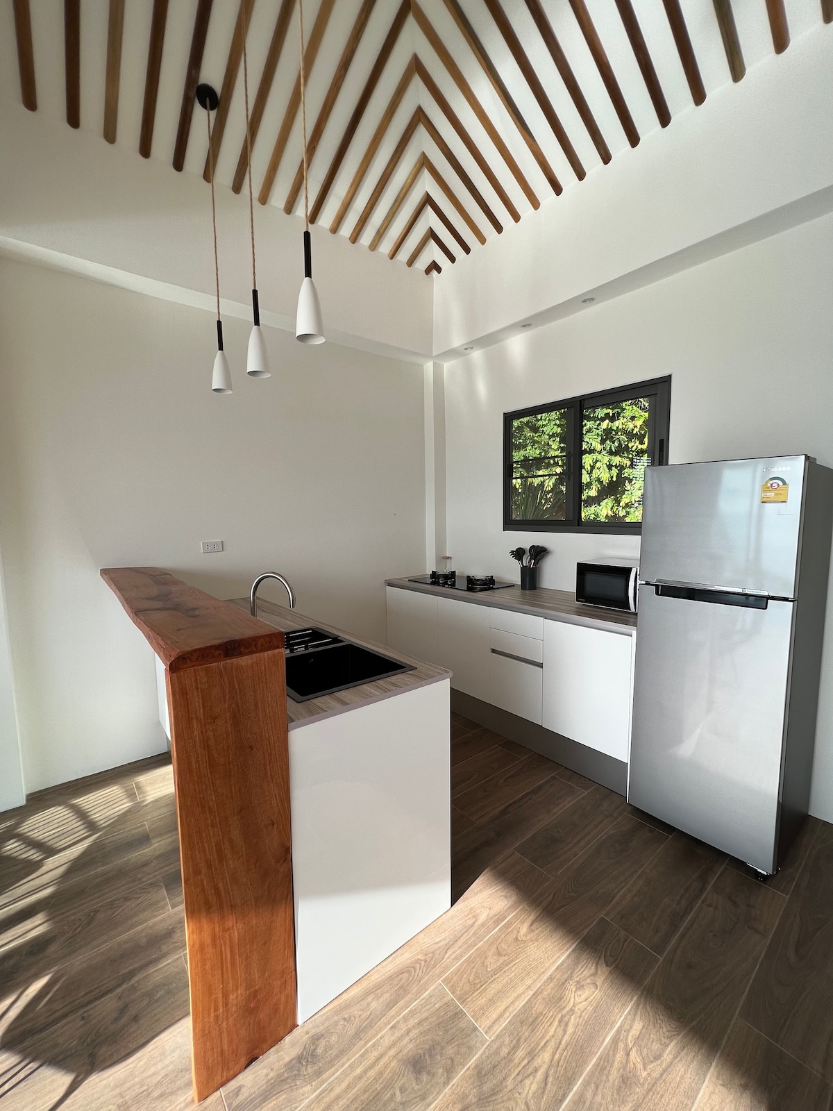 Escape to this handcrafted wooden cabin nestled in the jungle canopy with panoramic mountain views. Perfect for couples or remote workers craving nature immersion without sacrificing comfort. Swing in your private hammock watching sunrise over the hills, or work from the dedicated desk surrounded by treetops. Warm teak interiors, full kitchen, modern bathroom with artisan stone sink. Peaceful location away from the crowds yet 10 mins to beaches. Self check-in, A/C, fast WiFi.