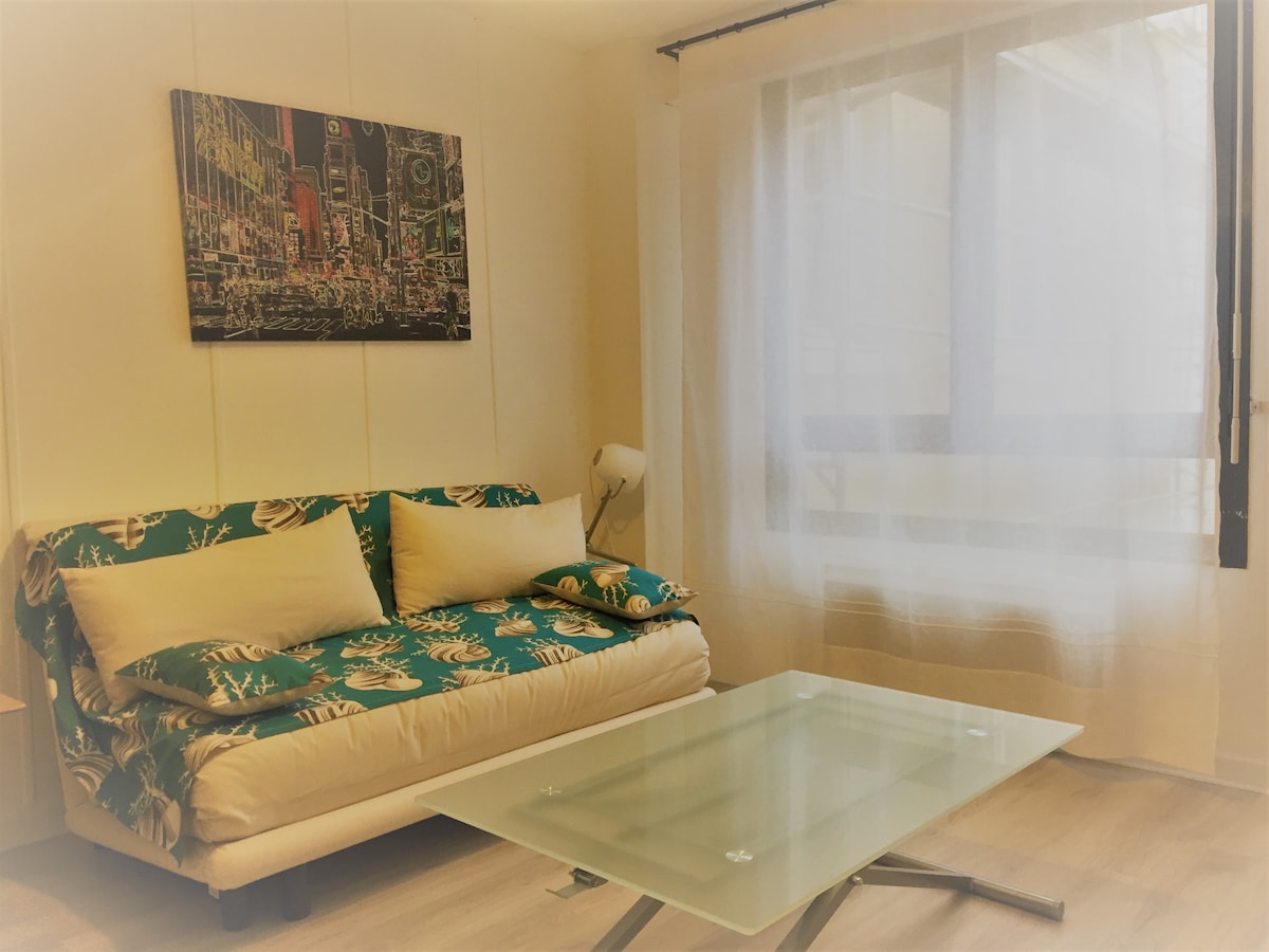 grand studio au rez de chaussée d'une résidence calme et sécurisée l'appartement dispose d'une place de parking privé juste devant l 'entree du studio L'appartement comprend un espace nuit avec lit 2 personnes ainsi qu'un espace salon avec canapé convertible pour 2 enfants ou 1 adulte (120cm) Cuisine entièrement équipée avec four, micro-ondes,frigo,cafetière,grille pain La salle de bain est pourvue d'une douche. Toilettes séparés. L appartement dispose d une télé et d'une connexion internet.