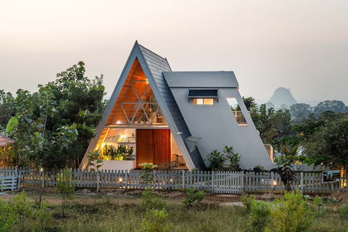 A Frame of Mind, tucked away in the quiet folds of Denkanikottai, a 2.5-hour drive from Bangalore, is the kind of escape that feels instantly cinematic. Here, modern minimalism wears a warm, soulful glow—sunlight gliding along A-frame angles, mountain silhouettes framing every moment, and a gentle lake breeze completing the scene.