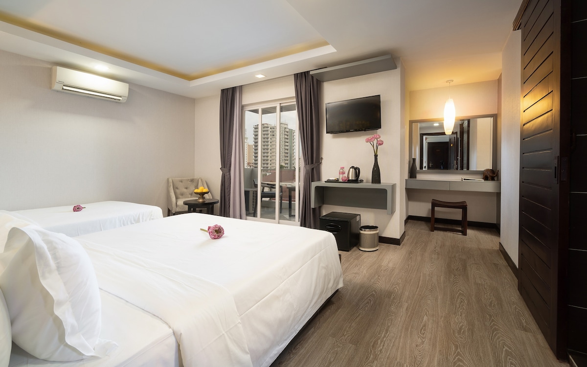 Junior Family Suite offer luxury and spaciousness with a contemporary feel. Your 45-sqm is highlighted by a comfortable (01 king size bed + 01 single bed) city views private balcony. Luxury inclusions are a separate shower stall with rain shower, hairdryer, complimentary toiletries, Duvet, sheets, robes, slippers, air- conditioning, TV, writing desk, Wi-Fi, armchairs, mini bar, drinking 3 bottles water, safety box, tea/ coffee. Included are Western or Asian breakfasts, room is made-up daily.