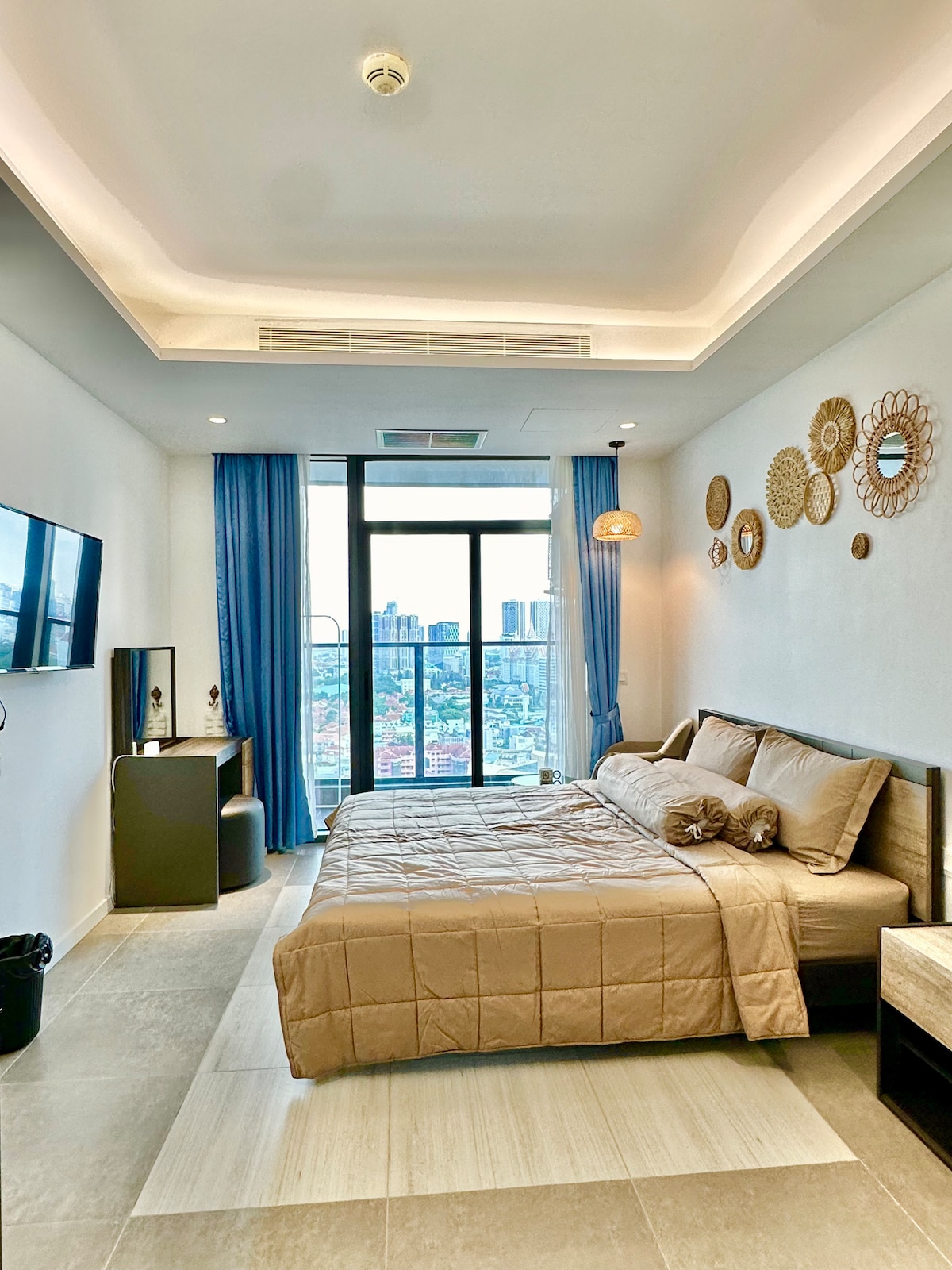 Welcome to your new studio sanctuary in the vibrant Beoung Trabek neighborhood (near Russian Market)! This fully furnished gem on the 26th floor offers a modern and comfortable living space. Step into your spacious 45sqm abode, where an open living room greets you with warmth and style. Free drinking water. Free Wifi. DAZN sports TV (NFL and more). Dartboard. Rooftop swimming pool (one floor above) and gym. Killer view. The queen bed is 150cm by 200cm. NO SMOKING. A/C AT 23/24, PLEASE.