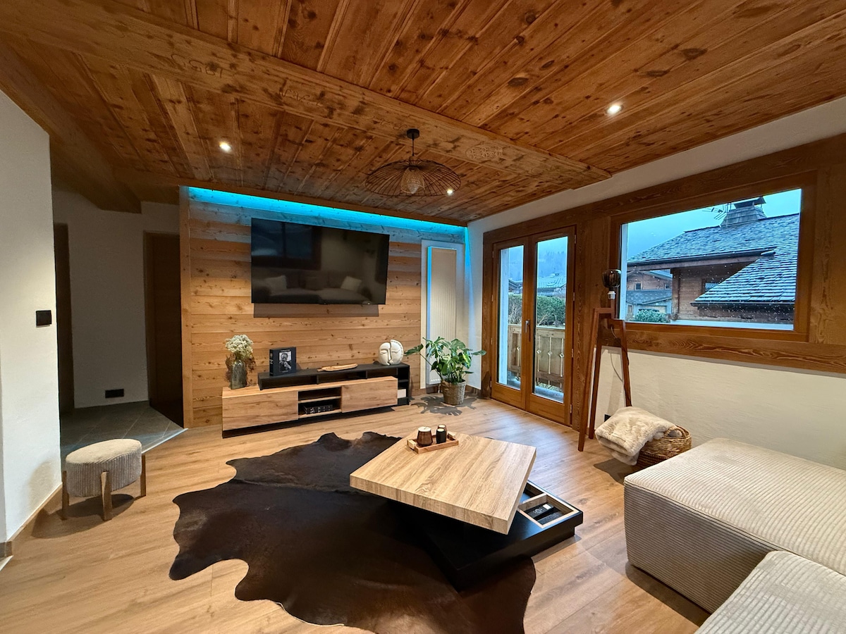 Tel un chalet, ce magnifique appartement offre une vue imprenable sur le Mont Blanc Avec ses 3 chambres, il accueille confortablement jusqu'à 7 personnes. Le grand salon avec sa cheminée est parfait pour des soirées chaleureuses en hiver La salle à manger est également très jolie avec une belle table en bois et la cuisine est équipée pour préparer des bons repas Une excellente option pour des vacances à la montagne en famille ou entre amis, avec tout le confort nécessaire pour un séjour agréable