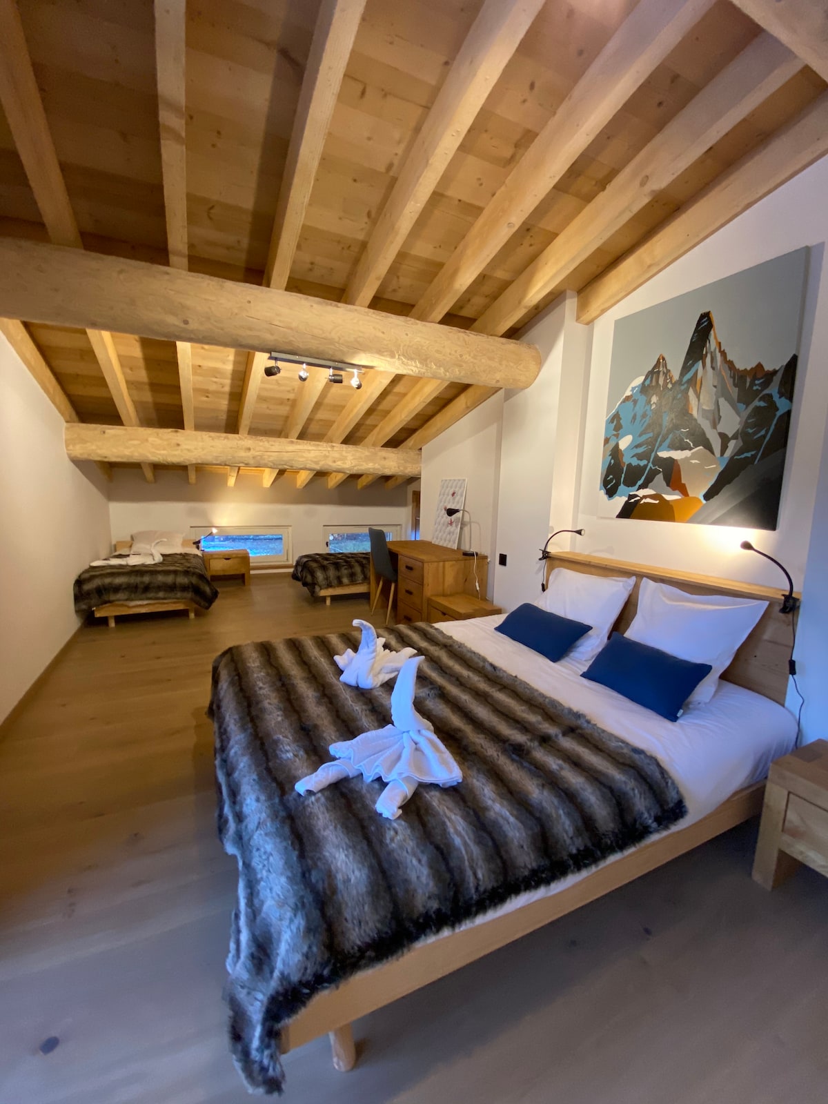 The bedroom has 2 single beds. The room is part of an authentic 8-bedroom chalet, accommodating 22 people. Breakfast is included. We offer evening meals (pre-reservation). You have access to common spaces and facilities; living room with fireplace, television, microwave & kettle, balcony, and WIFI. For € 25 per room per night you have 45 min. Sauna or 45 min. jacuzzi (or €40 for use of both) Chamonix center is at 3 km.