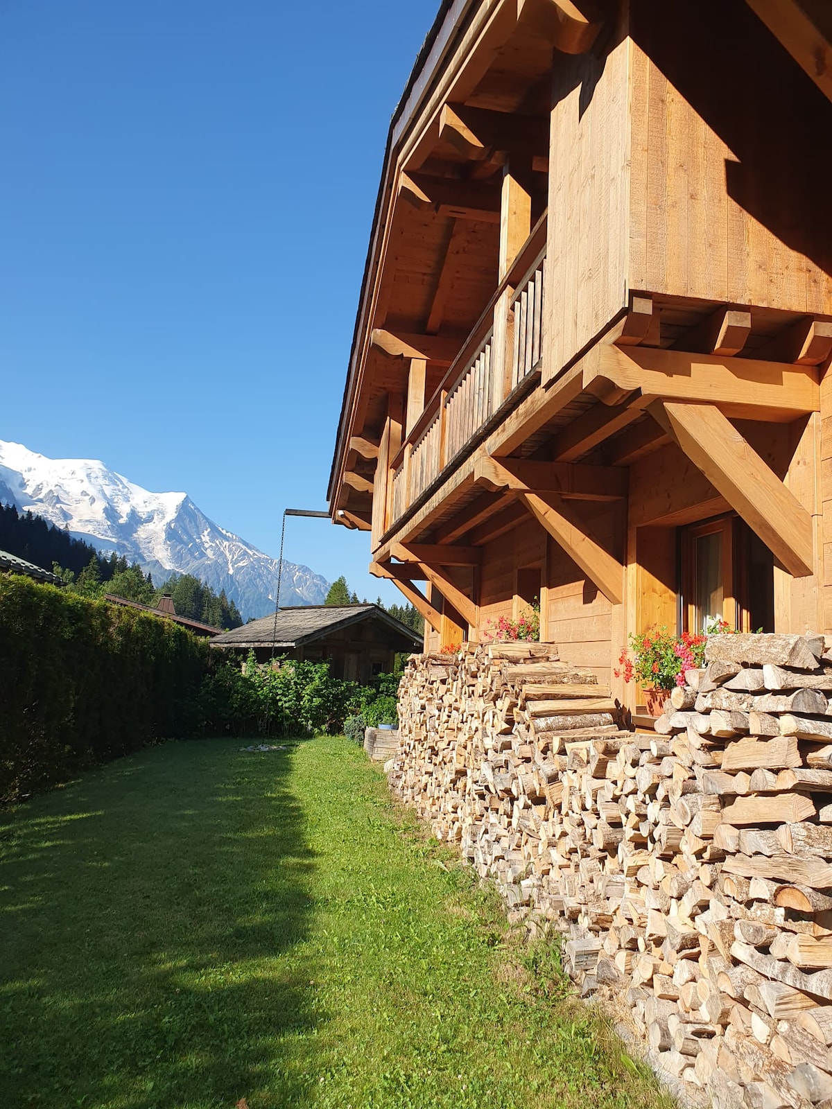Nice chalet for two people, ideally located in Chamonix, on the sunny side of the valley, with a breathtaking view on Mont Blanc, in a quite 4 000 square meters garden, close to everything (city center, ski facilities and hiking trails). One room with a double bed, a bathroom with shower and a nice sunny balcony (but no kitchen).