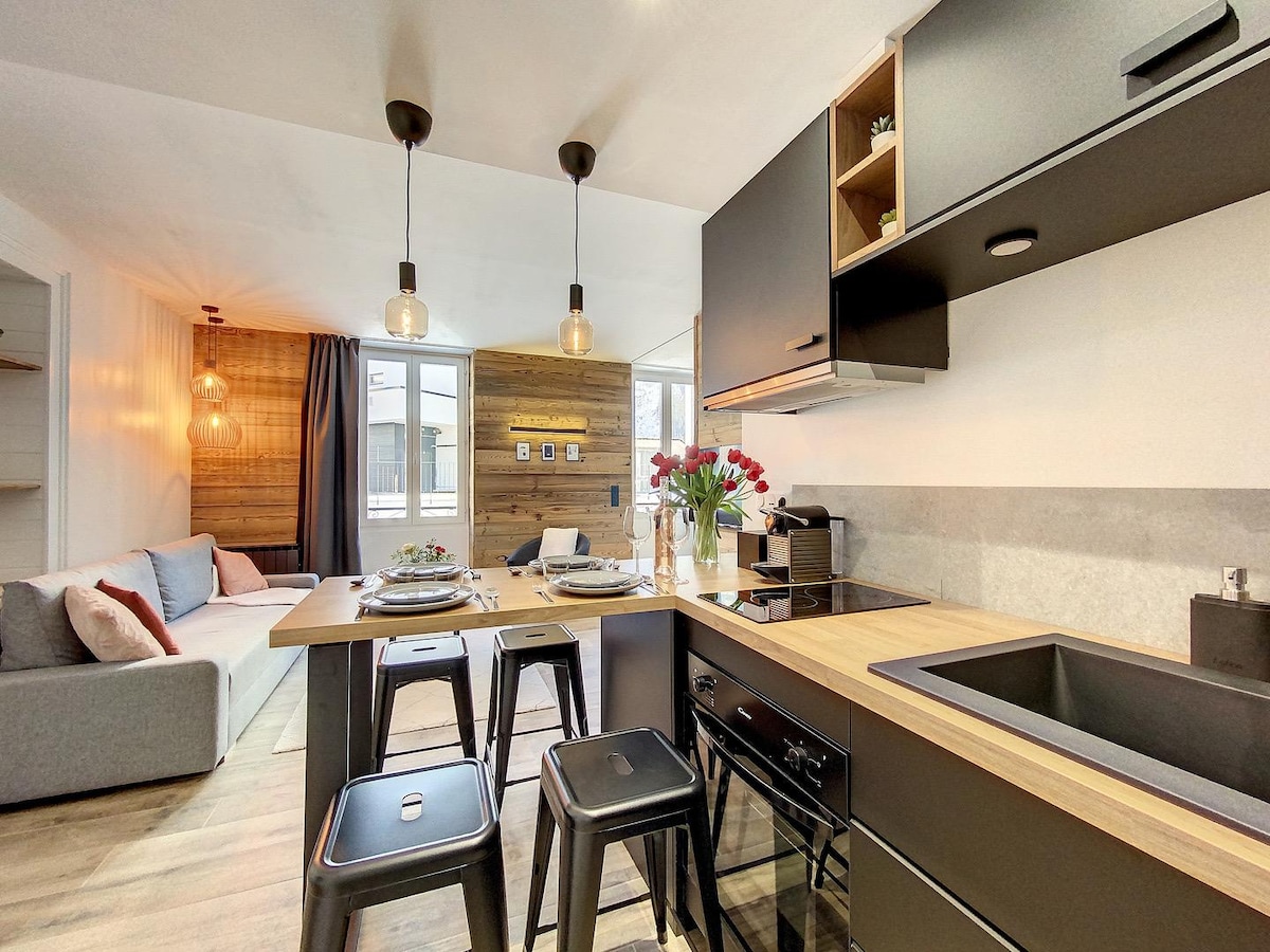 Incredible cocoon in the heart of Chamonix! L'Abri Vallot will seduce you with its location and decoration in a contemporary mountain style! Enjoy a private terrace with a sofa and a view of the glaciers and Mont-Blanc summit! A separate bedroom with a very comfortable double bed (separable into two single beds), a kitchen equipped with all the appliances! The walk-in shower to start a great day!