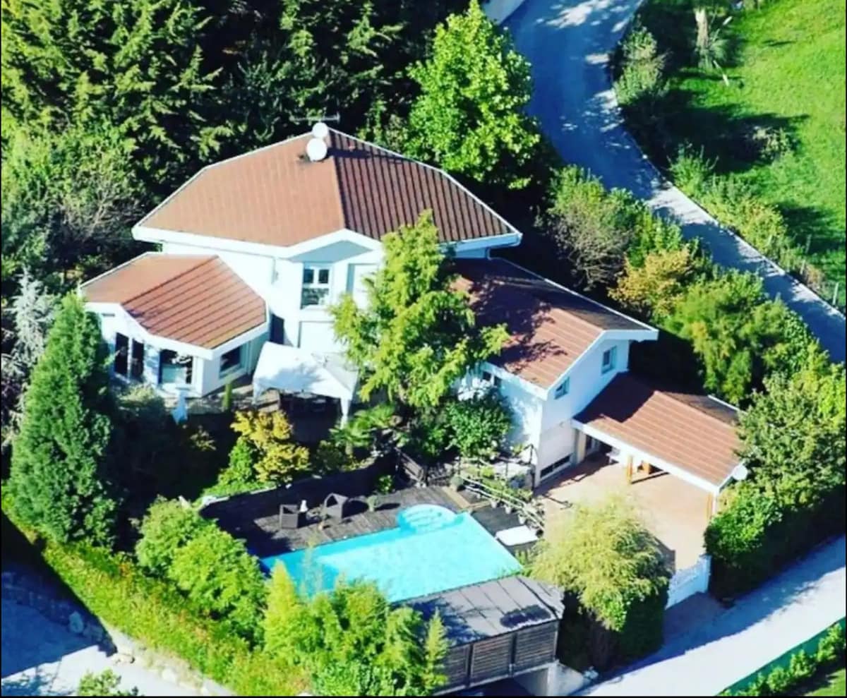 Bienvenue dans notre grande maison familliale. Vous pourrez profiter d'une magnifique piscine extérieure avec vue sur les montagnes. Notre maison est composée de 5 chambres spacieuses et d'un dortoir, ainsi que d'un vestiaire et d'un grand salon. Une cuisine équipée et une arrière-cuisine sont à votre disposition. Venez profiter du calme et de l'ensoleillement de Passy.