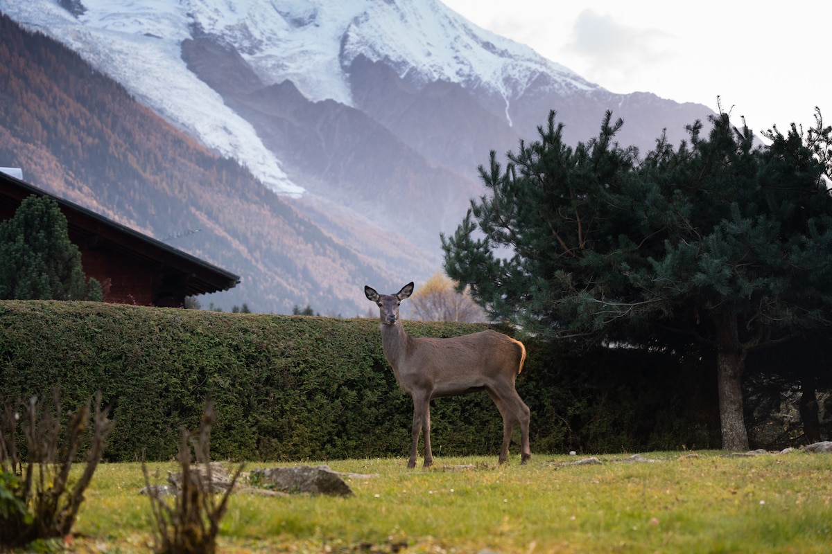 Add logs to a fireplace with a massive stone hearth and recline on a rustic wooden sofa. Gaze through picture windows at the alpine forest surrounding an authentic chalet. Return from the slopes and unwind in a luxury sauna in a cabin-chic bathroom. Une chambre de 25m2 avec lit double, rangements, armoire authentique. Un salon chaleureux et spacieux avec double baies vitrées donnant sur le Mt Blanc et cheminée. Et un sofa banquette convertible en 2 lits individuels. Cuisine pratique et toute équipée. Une salle de bain en granit avec douche et sauna 3 personnes. Une terrasse devant forêt et ruisseau ( avec fréquente visite des biches - voir photos ), avec fontaine et vue imprenable sur le massif du Mt Blanc. The chalet is an individual construction fully available and reserved for the guests. So are the terrace and the surroundings ( a small river, a private bridge and access to the forest ). A disposition pour toute question. Dans le hameau de Coupeau : Chalet authentique dans la forêt au-dessus des Houches avec vue exceptionnelle sur le massif du Mont Blanc. En Bord de petit torrent avec des biches A 5 min en voiture des Houches, à 10 min de Chamonix, à 1h de Genève. Easy access by road to the chalet. 2 kms from Les Houches and 10 kms from Chamonix. Parking just behind the chalet A fully renovated old chalet. With all modern comfort ( inc Sauna for 3 ) and top decoration. A unique view on the MontBlanc chain. The chalet is in the hamlet of Coupeau, in the forest above Les Houches, with exceptional views of Mont Blanc. It's a 5-minute drive to Les Houches, 10 minutes to Chamonix, and an hour to Geneva.