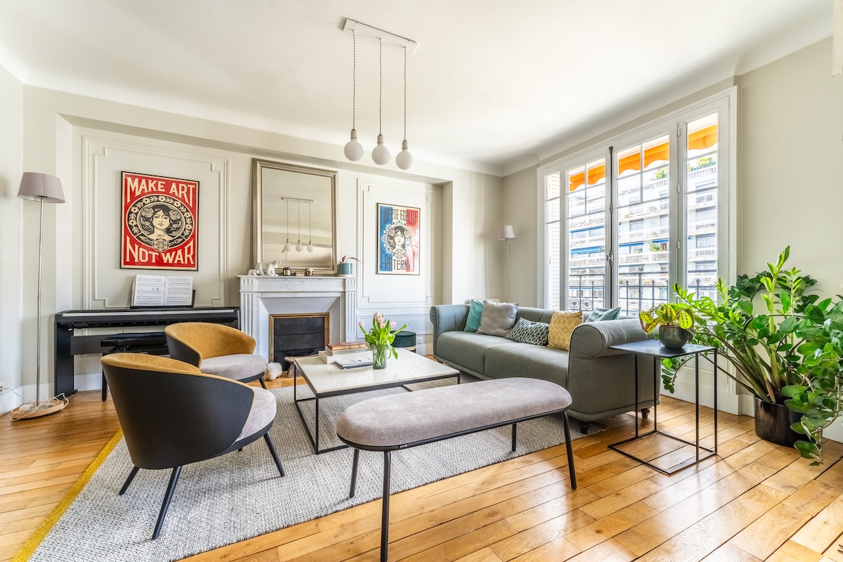 Beautiful 6 rooms apartment with wooden floors, mouldings, fireplaces and a big living-dining room with a Steinway grand piano. Very well situated in a uplifting and very practical to visit district of Paris. Just a few steps from the metro station!