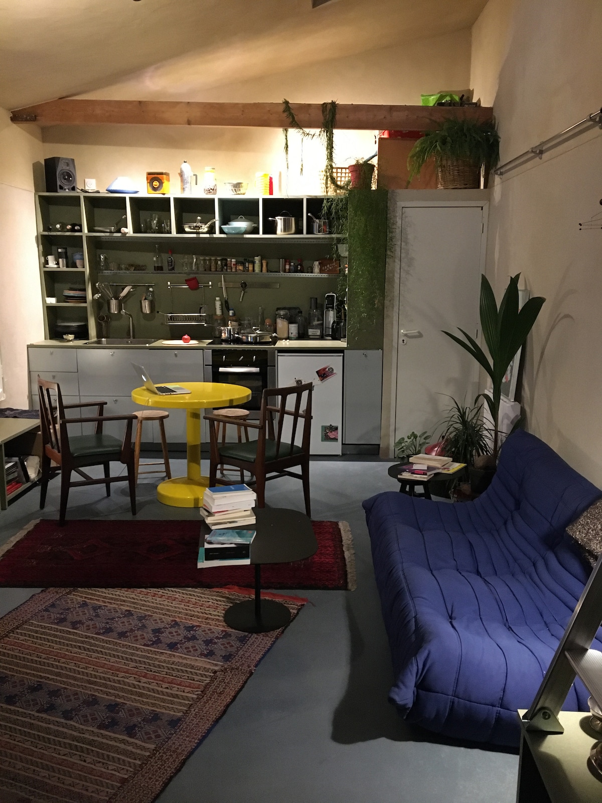 Our urban Loft is located at the limit of the 9th and 2nd by Boulevard Haussmann! The renovation of about 300sqf includes high ceilings, concrete floors, a fully equipped kitchen with a bar area – a living area with a futon bed, and a queen size bed on the loft. Located on the ground floor, the space stays cool during warm days. Enjoy walking to restaurants, bars, and fancy stores! 6 metro and buses minutes’ walk away!