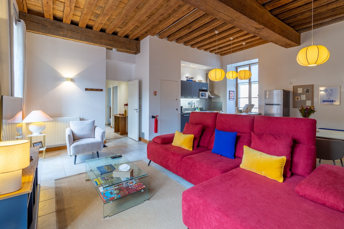 🚩 Bienvenue au Loft ! 🎁 Une bouteille de champagne offerte en cadeau de bienvenue 🥂🍾 🏠↔️Très spacieux, Loft de 150 m2 💤 Calme et confortable 🤴 Lit King Size 👸 Lit Queen Size 🛋️ Canapé convertible 🧖♀️🫧 Baignoire balnéo dans la salle de bain pour vous détendre 📽️🛋️ Vidéoprojecteur 4K dans le salon, comme au cinéma 🅿️🚘 Parking gratuit, privé et sécurisé sur place. Largeur : 2m25. Longeur 4m90. Hauteur : 2m00 🎅 Le marché de Noël en décembre est à 15 minutes à pied