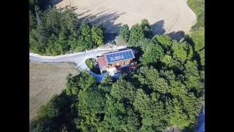 Chalet relaxant dans un paysage paisible. Pour couples, enfants et animaux. Cuisine équipée, poêle à bois, airco, 1 chambre à coucher avec lit double et vue panoramique, 1 chambre à coucher avec lits jumeaux (escalier raide, dû à la forme triangulaire du chalet) + 1 canapé-lit, salle de bain, Wifi, Netflix. BBQ. Sauna extérieur avec vue panoramique. Pret pour decouvrir la nature. Mégacentre commercial a 5 km